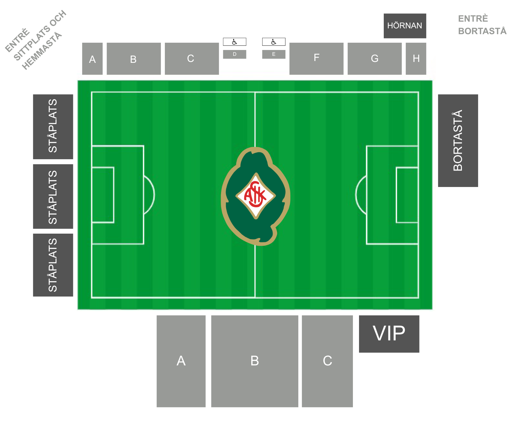 Ståplats hemmasuportrar och sittplats (norra och södra läktaren) nås från nordvästra entrén (Nya entrén) och bortastå nås från nord/nordöst och Skaraborgsgatan. Sektionen "Bortastå" är endast öppen om biljettkategorin för Bortastå finns till försäljning (om inte så är det det övriga biljettkategorier och och entré nordväst som gäller. Kom ihåg att parkeringsplatserna är begränsade så ta gärna buss, cykel eller en promenad till Södermalms IP om ni har möjligheten